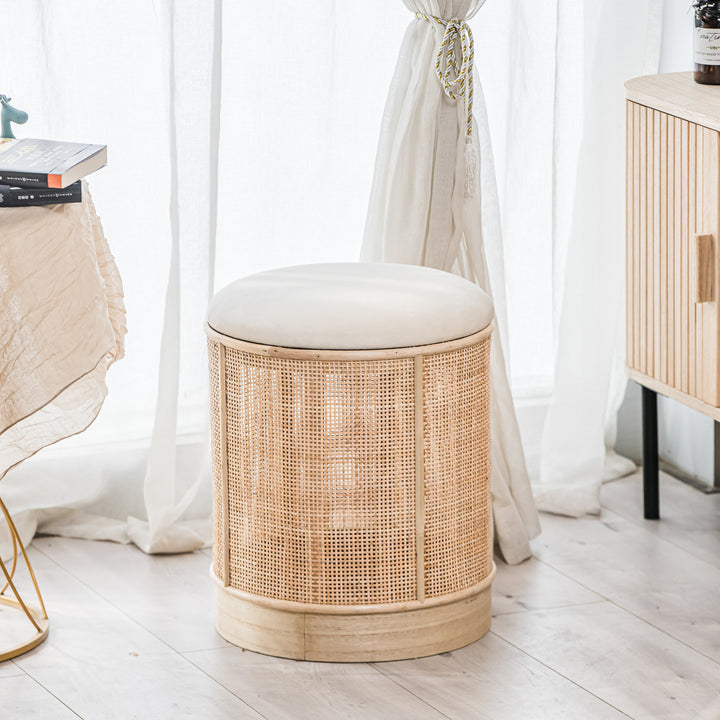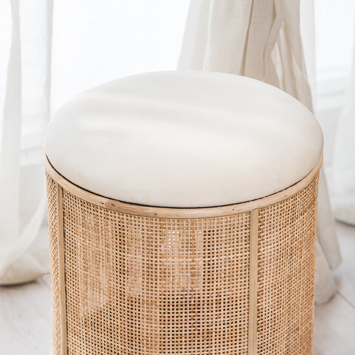 Le pouf CHUO avec son design moderne à tout ce qu'il faut pour embellir votre intérieur. Chambre, bureau ou salon, il saura trouver sa place dans votre intérieur. L'assise circulaire garnie avec du velours premium et une mousse de densité supérieure offre un confort de haute qualité. La base rotin et bois assure solidité pour une utilisation longue durée. Pouf facile à l'entretien, un coup de chiffon humide vous suffira pour les nettoyer.