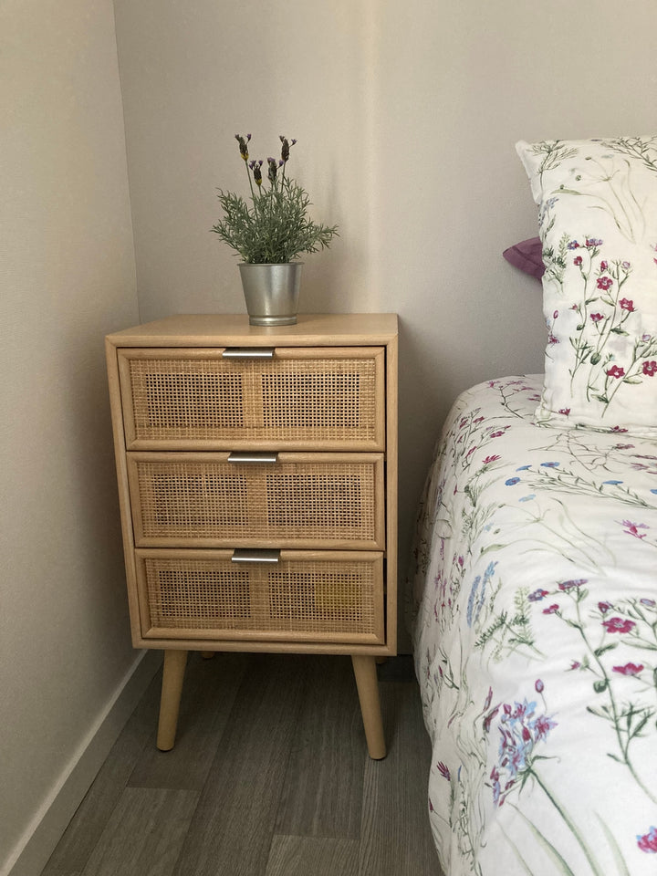 ✔️Fonction: Avec son design scandinave et sa structure en bois massif, la table NAGOYA à tout ce qu'il faut pour embellir votre intérieur. Salle à manger, chambre, bureau ou salon, elle saura trouver sa place dans votre intérieur. Ses 3 tiroirs en rotin/cannage offrent avec style des possibilités de rangements pratiques. Les poignées sont en métal finition chromée. Polyvalente, elle peut servir de commode, chevet, table d'appoint ou encore de bout de canape.